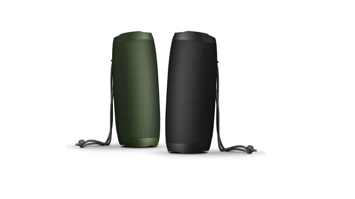 Il est disponible en deux couleurs: espace (noir et armée (Vert militaire). Les couvercles des haut-parleurs ont un garniture chromée, ce qui lui donne un look plus premium. Gardez à l’esprit qu’avoir une forme cylindrique asymétrique il ne reste pas totalement droit lorsque vous le mettez à la verticale ou à l’horizontale. Précisément, en position horizontale, il coulisse jusqu’à atteindre les boutons, qui sont situés sur l’un des côtés (bouton d’alimentation, volume +/- et bluetooth).