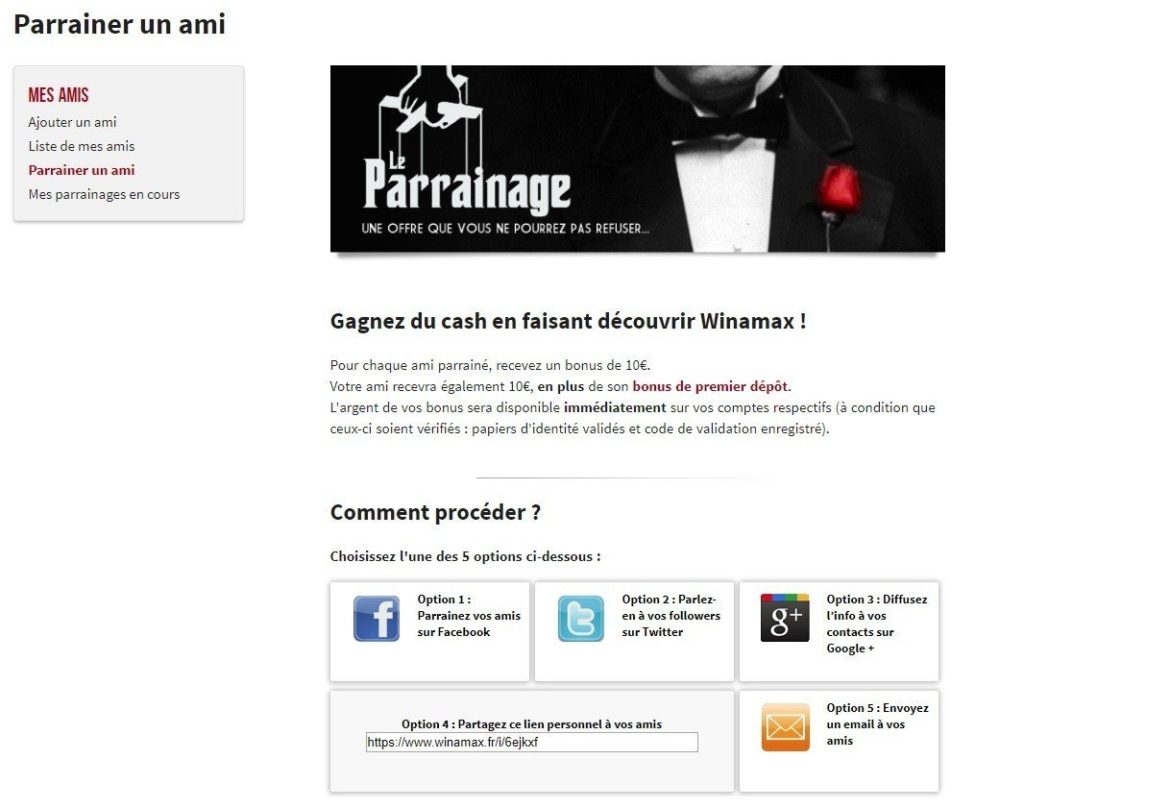 Pour parrainer un ami, il est possible de l’inviter via Facebook, Twitter, par email ou via un lien à partager. Votre ami doit créer un compte sur Winamax.fr et effectuer un dépôt (minimum : 15€) pour que le parrainage soit validé.