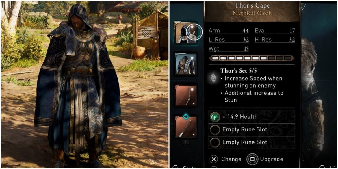 ainsi Does Thor have a cloak in AC Valhalla? Thor’s complete armor set in AC Valhalla contains 5 items in total. These are armor pieces, Thor’s helmet, Cloak, and Mjolnir (Thor’s Hammer).